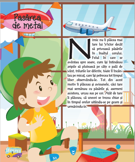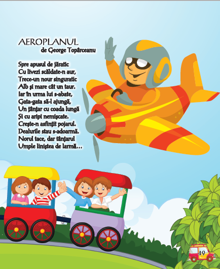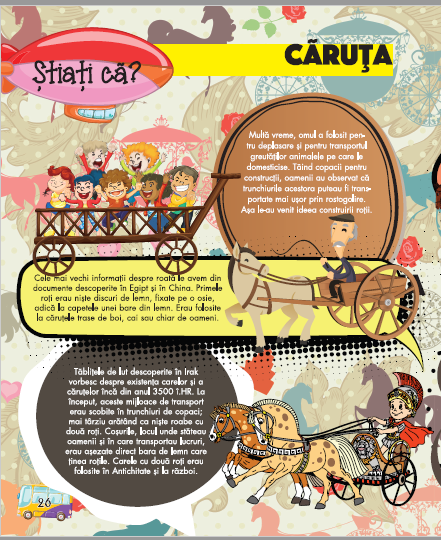 Cartea MIJLOACE DE TRANSPORT contine povesti, informatii despre istoria transportului si mijloacele de transport de la roata pana la nava spatiala, reguli de circulatie, poezii, ghicitori, jocuri si pagini tematice de colorat.