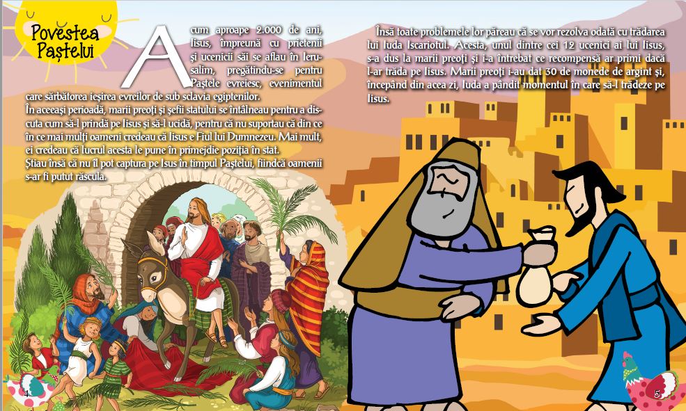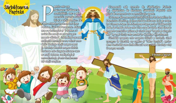 Cartea PASTELE PENTRU CEI MICI, facand parte din seria cu acelasi nume, contine povestiri despre sarbatoarea Pastelui si a evenimentelor din Saptamana Mare,  dar si povestiri cu morala , poezii, jocuri si pagini tematice de colorat.