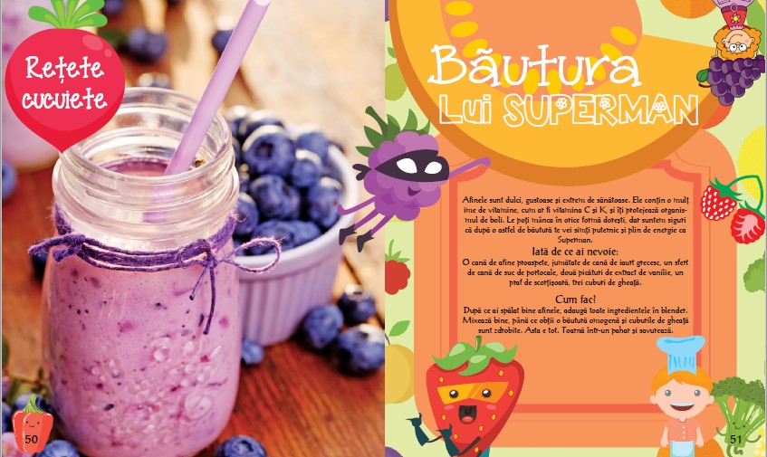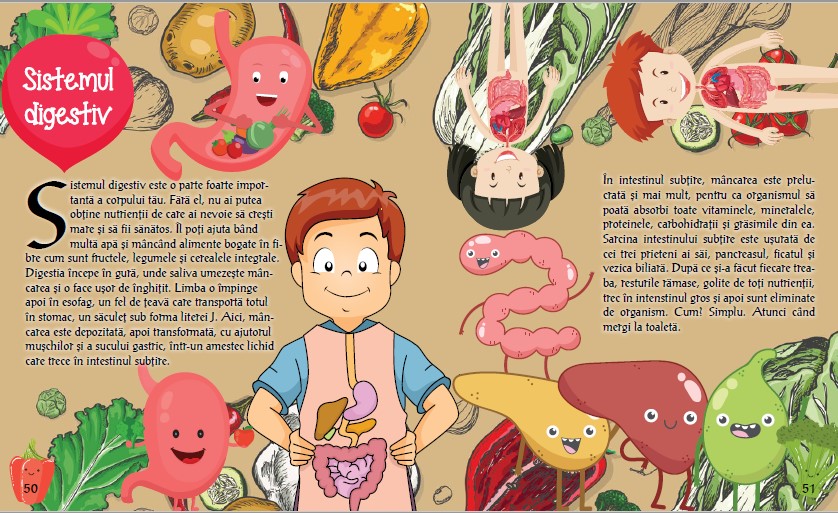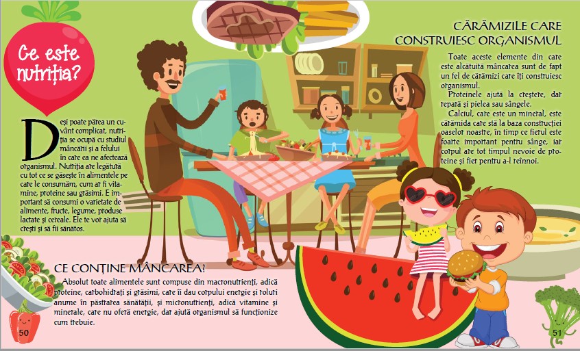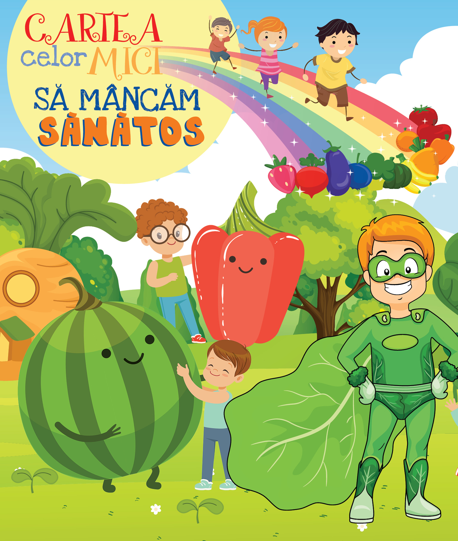 Cartea SA MANCAM SANATOS contine povesti, informatii despre nutrienti, grupe de alimente, sistem digestiv, piramida alimentara, propuneri de meniu, poezii, retete, jocuri si pagini tematice de colorat.